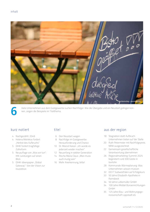 18 Stagnation statt Aufbruch: Unternehmen treten auf der Stelle 20 Ruth Petermeier mit Nachfolgepreis. NRW ausgezeichnet 22 Gemeinsam gesellschaftliche Verantwortung übernehmen 26 Regionalmarketing-Summit 2025 begeistert rund 300 Gäste in Iserlohn 28 Kommunale Wärmeplanung: Was Unternehmen wissen müssen 32 DO IT Südwestfalen auf Erfolgskurs 33 50 Jahre Elisabeth-Apotheke in Ramsbeck 34 50 Jahre Lütkemüller GmbH 34 100 Jahre Middel Büroeinrichtungen GmbH 35 125 Jahre Bau- und Wohnungsgenossenschaft Lippstadt eG