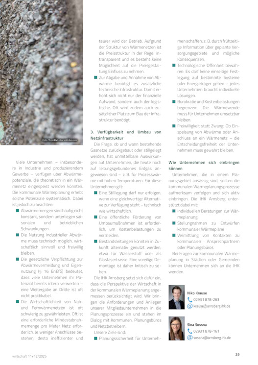 3. Verfügbarkeit und Umbau von Netzinfrastruktur Die Frage, ob und wann bestehende Gasnetze zurückgebaut oder stillgelegt werden, hat unmittelbare Auswirkungen auf Unternehmen, die heute noch auf leitungsgebundenes Erdgas angewiesen sind – z. B. für Prozesswärme mit hohen Temperaturen. Für diese Unternehmen gilt: Eine Stilllegung darf nur erfolgen, wenn eine gleichwertige Alternative zur Verfügung steht – technisch wie wirtschaftlich. Eine öffentliche Förderung von Umbaumaßnahmen ist erforderlich, um Kostenbelastungen zu vermeiden. Bestandsleitungen könnten in Zukunft alternativ genutzt werden, etwa für Wasserstoff oder als Glasfasertrasse. Eine voreilige Demontage ist daher kritisch zu sehen. Die IHK Arnsberg setzt sich dafür ein, dass die Perspektive der Wirtschaft in der kommunalen Wärmeplanung angemessen berücksichtigt wird. Wir bringen die Anforderungen und Anliegen unserer Mitgliedsunternehmen in die Planungsprozesse ein und stehen im Dialog mit Kommunen, Planungsbüros und Netzbetreibern. Unsere Ziele sind: Planungssicherheit für Unterneh-