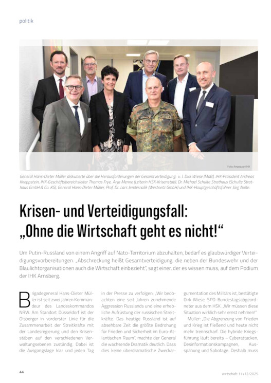 Krisen- und Verteidigungsfall: „Ohne die Wirtschaft geht es nicht!“ Um Putin-Russland von einem Angriff auf Nato-Territorium abzuhalten, bedarf es glaubwürdiger Verteidigungsvorbereitungen. „Abschreckung heißt Gesamtverteidigung, die neben der Bundeswehr und der Blaulichtorganisationen auch die Wirtschaft einbezieht“, sagt einer, der es wissen muss, auf dem Podium der IHK Arnsberg.