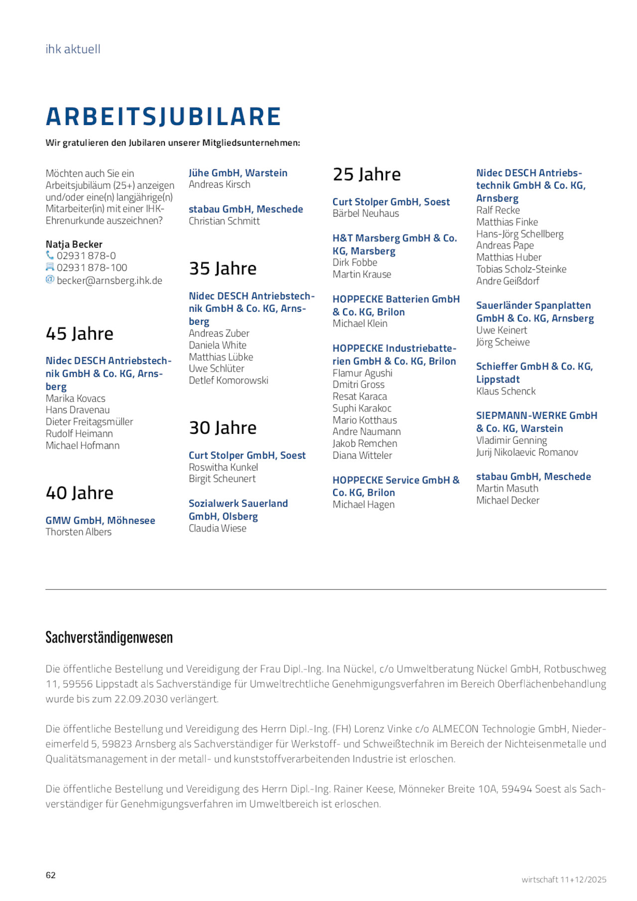 Möchten auch Sie ein Arbeitsjubiläum (25+) anzeigen und/oder eine(n) langjährige(n) Mitarbeiter(in) mit einer IHKEhrenurkunde auszeichnen? Natja Becker 02931 878-0 02931 878-100 becker@arnsberg.ihk.de