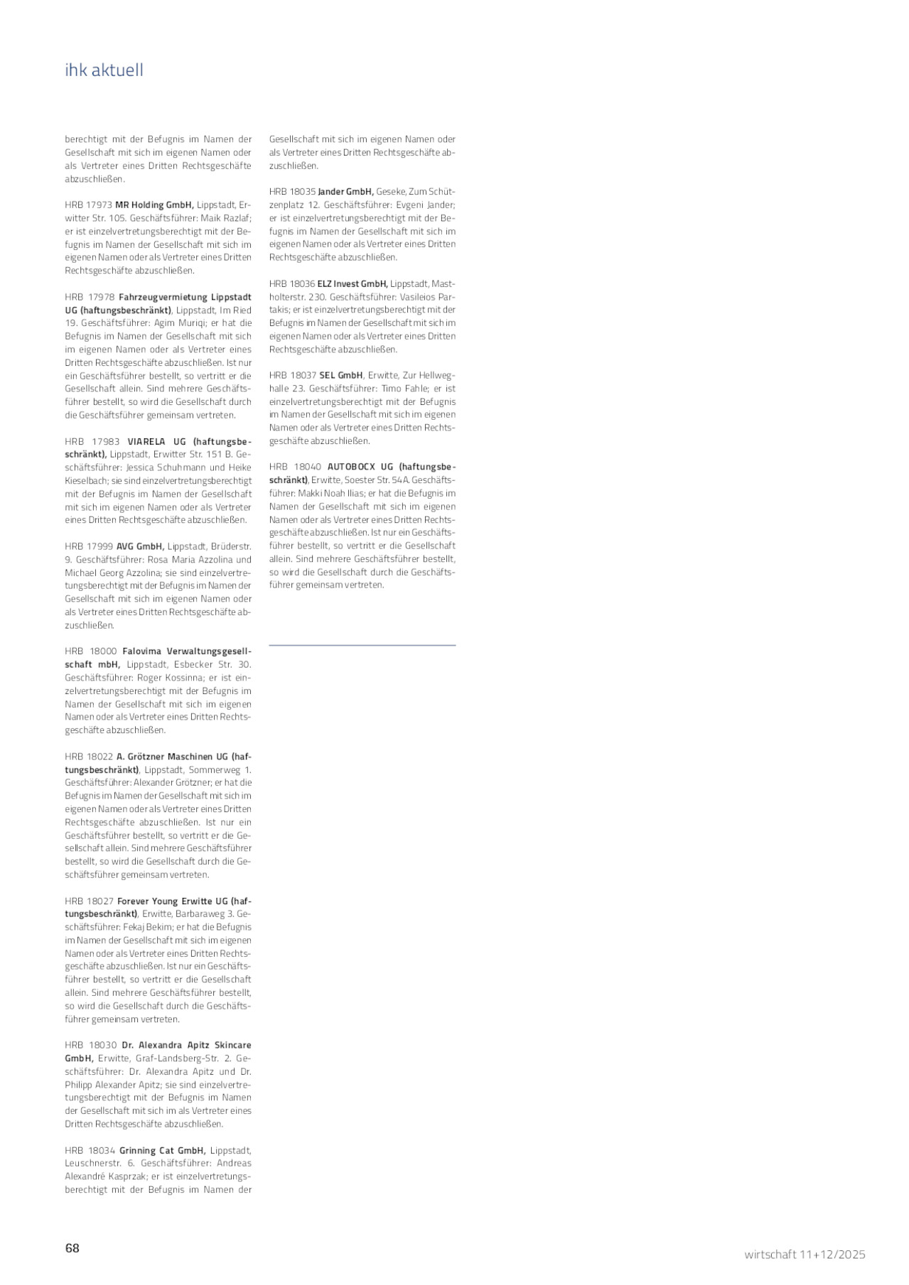 berechtigt mit der Befugnis im Namen der Gesellschaft mit sich im eigenen Namen oder als Vertreter eines Dritten Rechtsgeschäfte abzuschließen. HRB 17973 MR Holding GmbH, Lippstadt, Erwitter Str. 105. Geschäftsführer: Maik Razlaf; er ist einzelvertretungsberechtigt mit der Befugnis im Namen der Gesellschaft mit sich im eigenen Namen oder als Vertreter eines Dritten Rechtsgeschäfte abzuschließen. HRB 17978 Fahrzeugvermietung Lippstadt UG (haftungsbeschränkt), Lippstadt, Im Ried 19. Geschäftsführer: Agim Muriqi; er hat die Befugnis im Namen der Gesellschaft mit sich im eigenen Namen oder als Vertreter eines Dritten Rechtsgeschäfte abzuschließen. Ist nur ein Geschäftsführer bestellt, so vertritt er die Gesellschaft allein. Sind mehrere Geschäftsführer bestellt, so wird die Gesellschaft durch die Geschäftsführer gemeinsam vertreten. HRB 17983 VIARELA UG (haftungsbeschränkt), Lippstadt, Erwitter Str. 151 B. Geschäftsführer: Jessica Schuhmann und Heike Kieselbach; sie sind einzelvertretungsberechtigt mit der Befugnis im Namen der Gesellschaft mit sich im eigenen Namen oder als Vertreter eines Dritten Rechtsgeschäfte abzuschließen. HRB 17999 AVG GmbH, Lippstadt, Brüderstr. 9. Geschäftsführer: Rosa Maria Azzolina und Michael Georg Azzolina; sie sind einzelvertretungsberechtigt mit der Befugnis im Namen der Gesellschaft mit sich im eigenen Namen oder als Vertreter eines Dritten Rechtsgeschäfte abzuschließen.